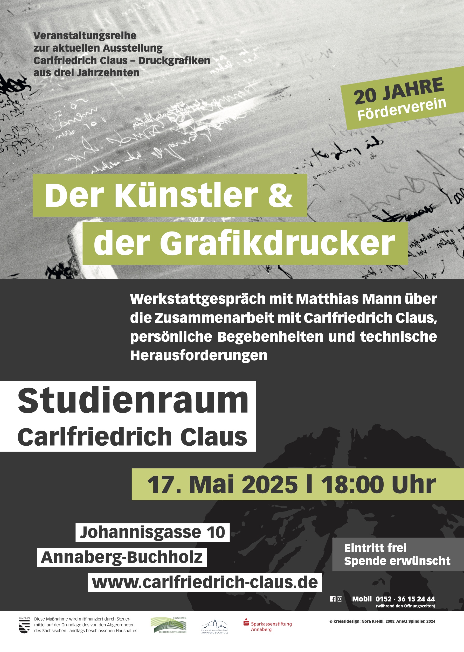 Werkstattgespräch mit Matthias Mann über die Zusammenarbeit mit Carlfriedrich Claus, persönliche Begebenheiten und technische HerausforderungenVeranstaltungsreihe zur aktuellen Ausstellung: "Carlfriedrich Claus - Druckgrafiken aus drei Jahrzehnten"